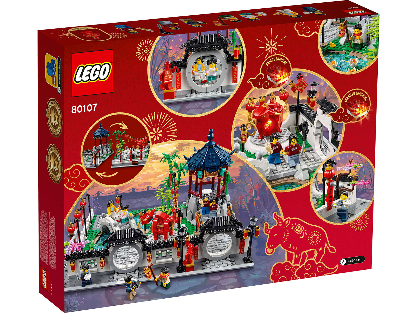Beende die Feierlichkeiten aus Anlass des chinesischen Neujahrsfests ganz spielerisch mit dem LEGO® Bauspielzeug „Frühlingslaternenfest“ (80107). Das Set enthält einen chinesischen Garten aus LEGO Steinen mit Mondtor, Pavillon, Teich und Brücke sowie eine Ochsenlaterne, die von einem LEGO Lichtstein erleuchtet wird, um das Jahr des Ochsen einzuläuten. Der Garten ist ein tolles Modellbauprojekt, bei dem auch Freunde und Geschwister mitmachen können und kann zusammen mit baubaren Laternen und traditionellen Spruchbändern geschmückt werden. Das Modell kann auch ganz individuell arrangiert werden.