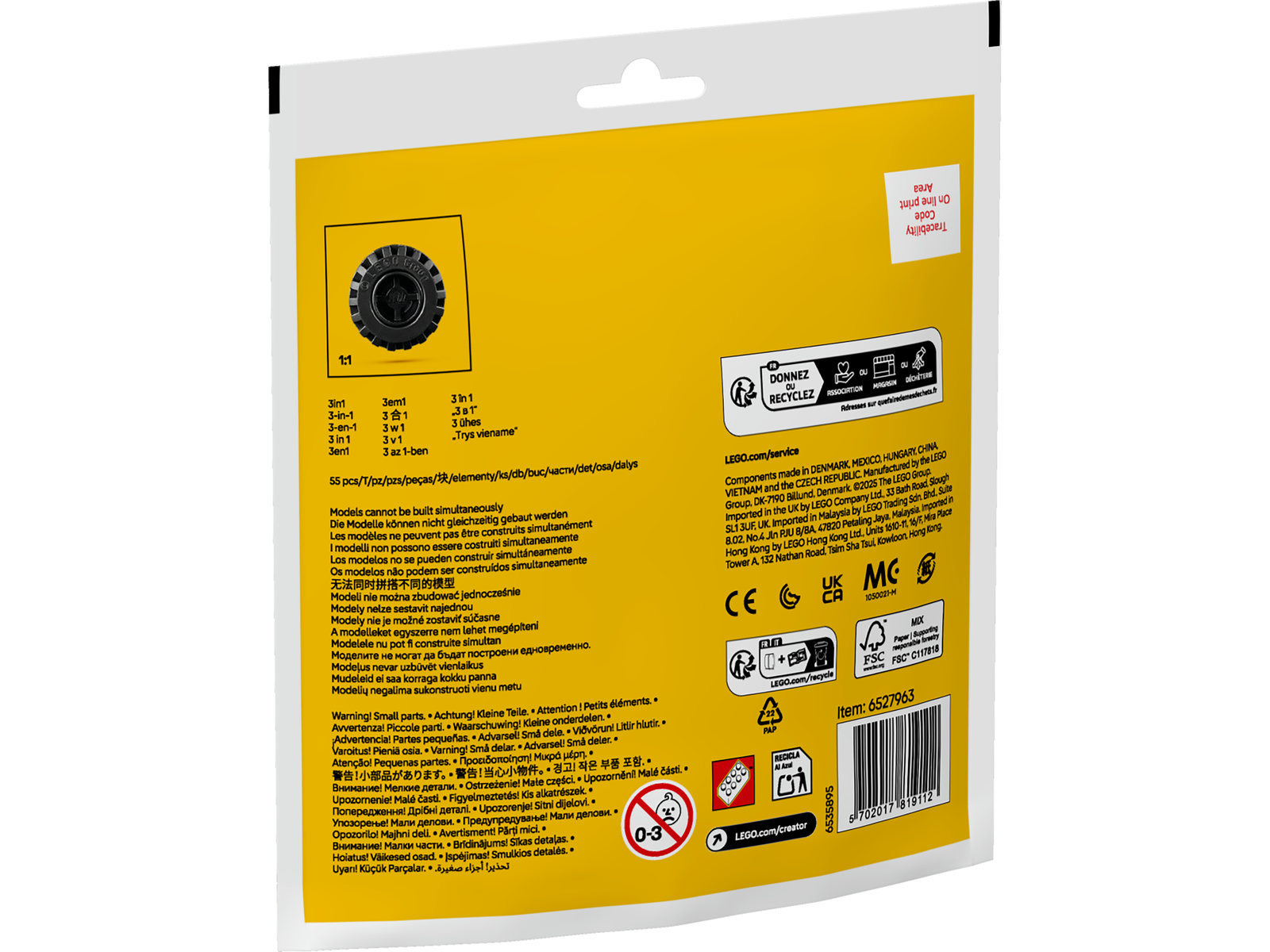 LEGO® Creator Tieflader mit Hubschrauber (31146) lässt Jungen und Mädchen ab 7 Jahren rasante Abenteuer darstellen. Kinder können die 270 Teile aus diesem 3-in-1-Spielset zu einem coolen Sattelzug zusammenfügen, der den LEGO Hubschrauber auf seinem Auflieger transportiert. Mit diesem LEGO Creator 3-in-1-Spielzeug kann dein Kind 3 x 2 verschiedene Fahrzeuge bauen. Den Tieflader mit drehenden Rädern und den Hubschrauber mit kreisenden Motoren kann man entweder in ein Propellerflugzeug mit Tanklaster oder für packende Rennen in einen Hot Rod und ein SUV umbauen. Aber natürlich lassen sich die Teile aus diesem Set auch zu eigenen fantasievollen Fahrzeugen zusammenstecken. LEGO Creator 3-in-1-Spielzeuge sind tolle Geschenke für Kinder, denn mit den Steinen in jeder Box kann dein Kind 3 verschiedene Modelle bauen und mit großer Begeisterung immer wieder umgestalten. 3-in-1-Sets bieten Kindern mit unterschiedlichsten Interessen stundenlanges Spielvergnügen mit einer breiten Auswahl an Modellen. Hierzu zählen rasante Fahrzeuge, faszinierende Tiere und detailreiche Stadtkulissen. 3 x 2 Fahrzeugmodelle in 1 Box: LEGO® Creator Tieflader mit Hubschrauber lässt Jungen und Mädchen ab 7 Jahren 3 x 2 verschiedene Fahrzeuge mit denselben Teilen bauen und immer wieder umbauen Unzählige Spielmöglichkeiten: 3 verschiedene Fahrzeugpaare bieten Kindern jede Menge Actionspaß: ein Sattelzug mit Hubschrauber, ein Flugzeug mit Tanklaster oder 2 LEGO® Flitzer – ein Hot Rod und ein SUV Fahrzeuge mit beweglichen Teilen: An jedem der Modelle dreht sich etwas, beispielsweise die Räder an den Autos, der Propeller am LEGO® Flugzeug und die Rotorblätter am Hubschrauber Modelle zum Ausstellen: Alle 3 LEGO® Fahrzeugpaare sind eigenständige Spielzeuge und können nach dem Spielen im Kinderzimmer ausgestellt werden Geschenk für Kinder ab 7 Jahren: Dieses 3-in-1-Spielzeug bietet ein faszinierendes Bau- und Spielerlebnis, ist eine tolle spontane Belohnung und lädt dein Kind zu vielen fantasievollen Rollenspielen ein Noch mehr 3-in-1-Spaß: Kombiniere die Modelle für noch mehr Spielspaß mit anderen separat erhältlichen LEGO® Creator 3-in-1-Sets LEGO® Creator Spielzeuge: Jedes 3-in-1-Set lässt Kinder 3 verschiedene Modelle aus ihren wichtigsten Interessenbereichen bauen, die unter anderem Tiere, Fahrzeuge und detailreiche Szenen aus dem Stadtleben darstellen Modelle zum Bauen und Spielen: Der baubare Sattelzug aus diesem 270-teiligen LEGO® Bauset ist 9 cm hoch, 26 cm lang und 6 cm breit