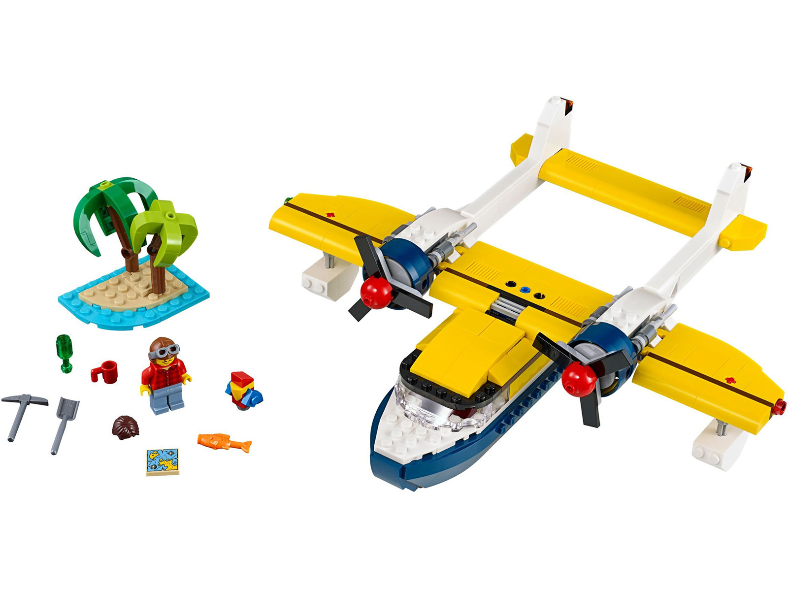 An Bord dieses riesigen Wasserflugzeugs gelangst du an faszinierende exotische Orte. Die zweimotorige Maschine besitzt eine Lackierung in leuchtendem Gelb, Weiß und Dunkelblau und verfügt über drehende Propeller, zwei Leitwerksträger, ein verstellbares Höhenruder, Schwimmer, eine aufklappbare Ladeluke sowie ein aufklappbares Cockpit mit detailreicher Instrumententafel. Ebenfalls enthalten sind eine Tropeninsel mit zwei Palmen sowie eine leere Flasche und eine Karte. Dieses LEGO® Creator 3-in-1-Modell lässt sich in eine Inselhütte oder ein Schnellboot umbauen. Enthält eine Minifigur.