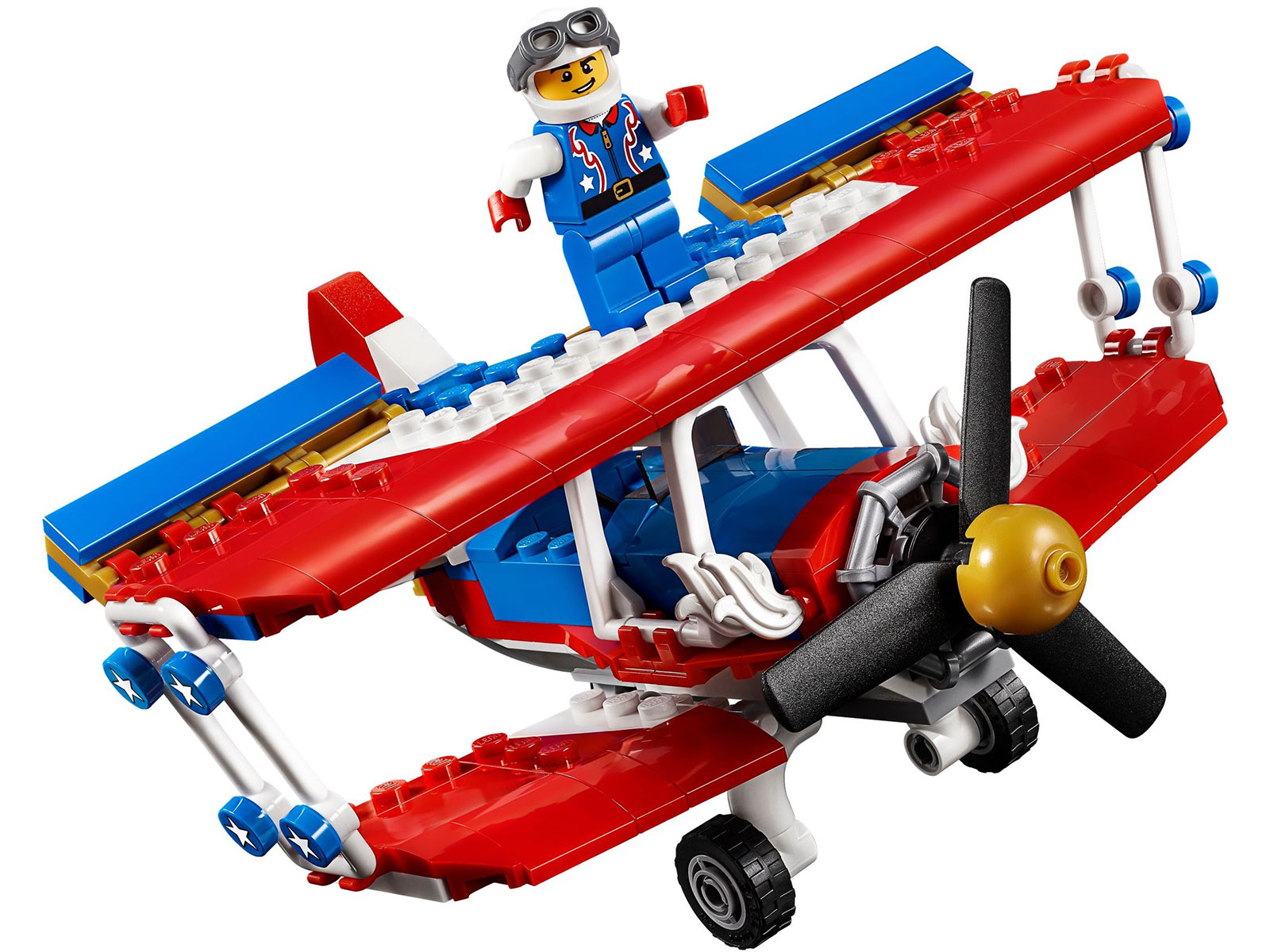 - Enthält einen klassischen Doppeldecker mit Minifiguren-Cockpit, drehendem Propeller und Fahrwerk.