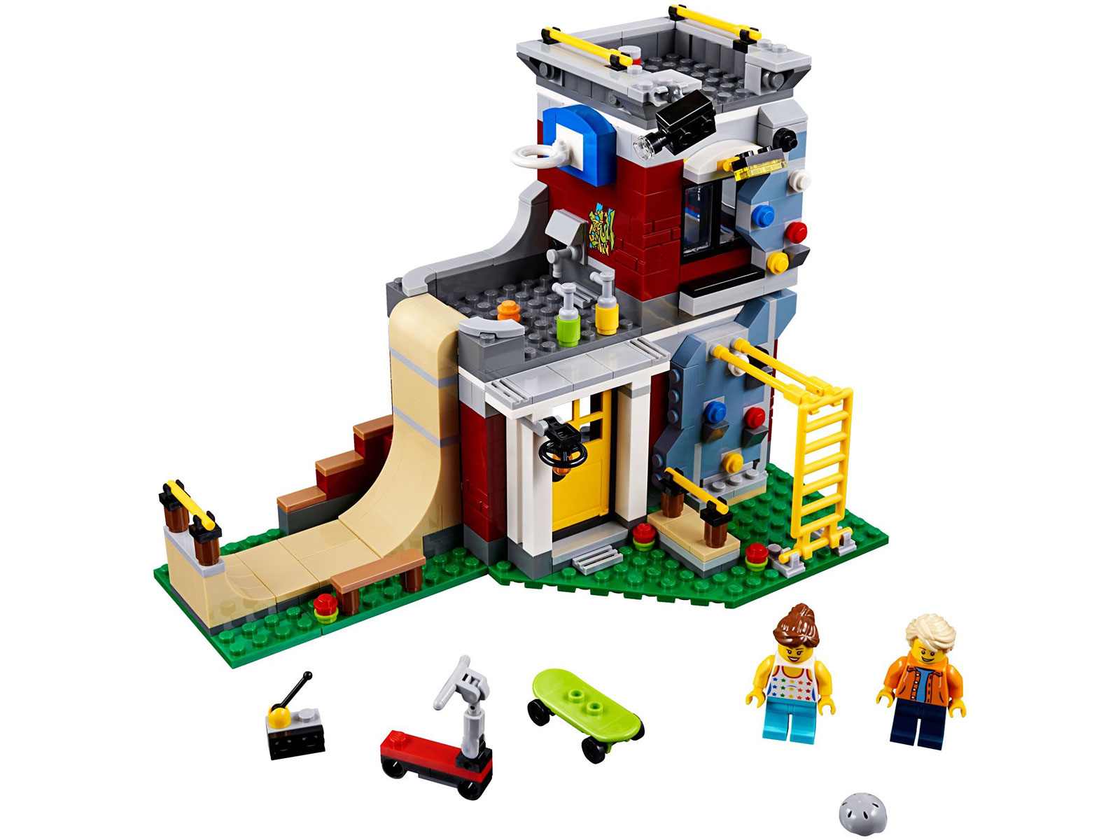 - Die baubaren Module lassen sich auch anders kombinieren, um eine Skateboardrampe auf dem Dach zu erschaffen. Die Fenster-, Tür- und sonstigen Modulsegmente können leicht ausgetauscht werden, um das Freizeitzentrum mithilfe des LEGO® Creator Modulsystems ganz individuell zu gestalten.