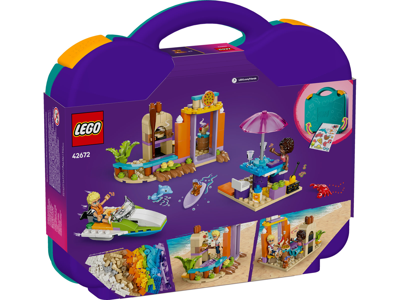 Dieses 2-in-1-Bauset nimmt Kinder auf eine kreative Reise mit und lässt sie verschiedene Strandkulissen bauen und immer wieder umgestalten. LEGO® Friends Kreativer Reisekoffer (42672) ist ein tolles Geschenk für Mädchen und Jungen ab 5 Jahren. Kinder können 3 Modelle bauen und dann zu einer völlig anderen Szene umgestalten oder die Teile zu etwas Coolem zusammenstecken, was der eigenen Fantasie entspringt. In diesem Set finden Kinder alles, was sie für spannende Rollenspiele brauchen. Sie können ein Wasserflugzeug mit drehendem Propeller, ein Strandcafé, einen Strandabschnitt mit Surfbrett und ein Strandcafé mit Sandburgen, Stühlen und Eiszubehör bauen. Dann kann man die Modelle in ein Schnellboot und eine Pizzeria mit Pizzaofen und Sitzecke im Freien verwandeln. 2 Spielfiguren, ein Hund und ein Delfin laden zu vielen Rollenspielen mit diesem Bauspielzeug ein. Nach all dem Bauspaß mit den Modellen kann man die Teile wieder im Koffer verstauen, wo sie fürs nächste Abenteuer griffbereit sind. Das Bauset beinhaltet auch einen Bogen mit Aufklebern, damit Kinder den Koffer ganz individuell gestalten können.