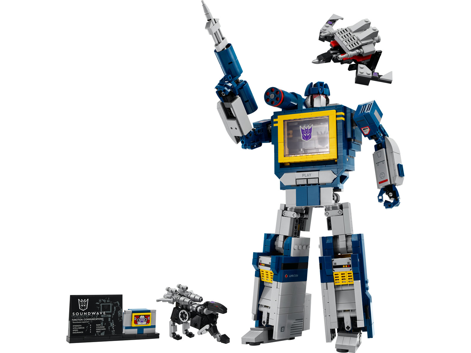 - Inhalt der Box: Alles, was du brauchst, um einen detailgetreuen LEGO® Icons Transformers: Soundwave mit Raketenpod, Laserblaster und Pfeilen sowie die Figuren Ravage und Laserbeak zu bauen