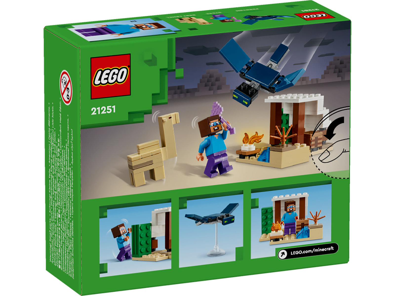 Dieses LEGO® Minecraft® Set für Gamer ab 6 Jahren ist das erste Bauspielzeug im Minecraft-Wüstenbiom. Steves Wüstenexpedition (21251) stellt Kinder vor die Herausforderung, ein Minecraft-Haus in einer feindseligen Umgebung zu bauen und es dann vor den Angriffen des fliegenden Phantoms zu beschützen. Dieses Geschenk für Jungen und Mädchen ab 6 Jahren lässt sich für Rollenspiele vielseitig umgestalten. Das Set beinhaltet 3 LEGO Minifiguren, darunter auch Steve, sowie eine Minecraft-Hütte im Wüstenbiom. Legendäre Minecraft-Elemente wie eine Werkbank, ein Lagerfeuer und diverse Teile einer typischen Wüstenkulisse dürfen natürlich nicht fehlen. Das Set ist ein tolles Geschenk für jeden Minecraft-Fan und lädt zu kreativen Abenteuern und spannenden Duellen ein, wenn das fliegende Phantom die Basis aus der Luft angreift. Neu in diesem LEGO Minecraft Set ist nicht nur Steves veränderte Miene, sondern auch das Babykamel. Dieses Geschenk für Kinder und Gamer lässt sich auch mit anderen separat erhältlichen Minecraft-Spielsets kombinieren.