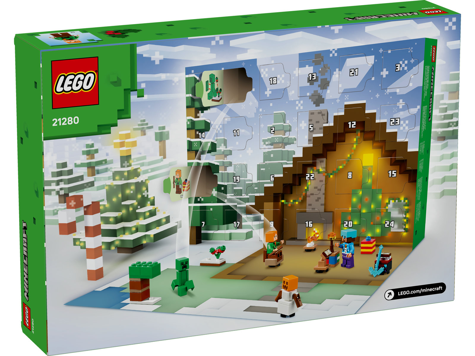Der LEGO® Minecraft® Adventskalender 2025 (21280) enthält 24 baubare Weihnachtsgeschenke, LEGO Minifiguren und Sammlerstücke, um Kindern und Minecraft Fans ab 7 Jahren an jedem Tag im Advent das Warten auf Weihnachten zu versüßen. Hinter den 24 Türchen können Kinder an jedem Tag im Advent ein Geschenk entdecken. Sie finden Minifiguren wie Alex, die einen Pulli mit dem Creeper™ trägt. Steve trägt einen Schneemann-Pullover und einen Diamanthelm und hält eine Spitzhacke. Ein Creeper steht neben einem Süßbeerenstrauch. Ein Ertrunkener hält einen Dreizack. Ein Streuner trägt eine Diamantrüstung. Auch ein Schneegolem, ein Zombie mit verzauberter Axt und ein Weihnachtsmann-Dorfbewohner mit Ofen laden zum Spielen ein. Kinder werden auch viele kleine Bauspielzeuge und cooles Zubehör aus dem beliebten Videospiel wiedererkennen. Man kann die Geschenke zu einem Mikro-Winterdorf für viele fantasievolle Abenteuer kombinieren, um sich das Warten auf Weihnachten zu versüßen. Eine ausklappbare Spielmatte bildet die perfekte Spielkulisse.