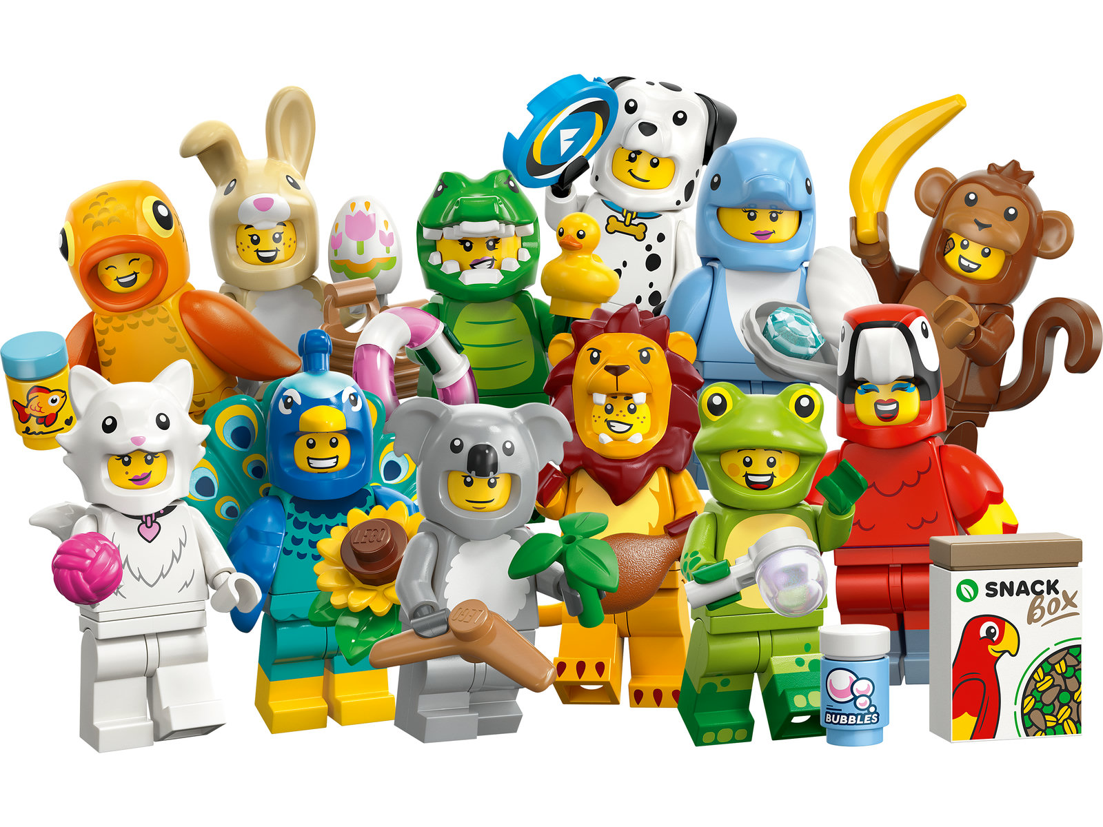 - FASZINIERENDES ZUBEHÖR: Jeder LEGO® Minifigur liegt mindestens 1 Zubehörteil bei. Zum Affen gehört beispielsweise eine Banane, zum Dalmatiner eine Frisbee, zum Goldfisch Fischfutter und zum Krokodil eine Badeente