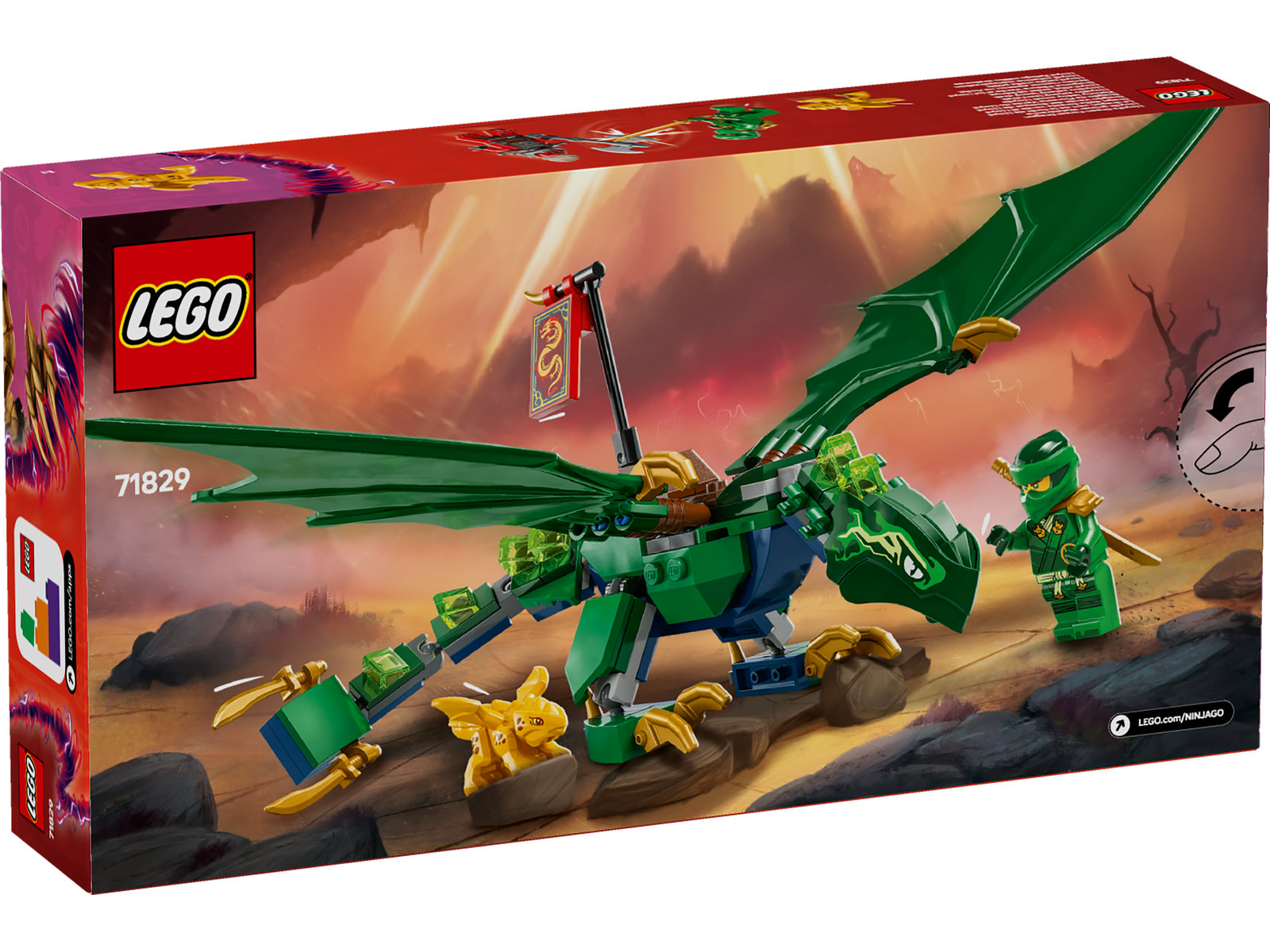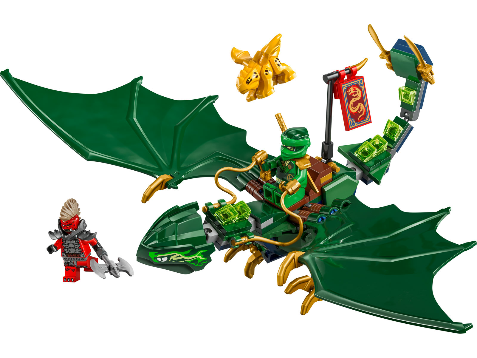 Lloyds grüner Walddrache (71829) ist ein Bau- und Spielset, mit dem Jungen und Mädchen ab 6 Jahren packende Actionszenen in der Luft aus der 3. Staffel der TV-Serie NINJAGO® Aufstieg der Drachen nachstellen können. Das Set beinhaltet einen imposanten Spielzeugdrachen, der Schwanz, Hals, Beine, Flügel und Hände bewegen kann. Der Drache trägt einen Sattel auf dem Rücken, damit eine Minifigur auf ihm reiten kann. Dieses LEGO® NINJAGO Drachenset beinhaltet auch 2 Minifiguren: Lloyd trägt ein goldenes Katana, und der böse Drachenspäher schwingt eine Axt. Und das Modell des goldenen Drachenbabys lässt Kinder so tun, als würden sie ein Tier umsorgen. Das LEGO NINJAGO Sortiment an baubaren Ninja-Spielzeugen umfasst Mechs, Flitzer und Tempel, die Kinder zusammen mit ihren Ninja-Helden in eine Fantasy-Abenteuerwelt eintauchen lassen. Jedes dieser Actionspielsets kann auch mithilfe der LEGO Builder App gebaut werden, die dich und dein Kind auf ein ebenso einfaches wie intuitives Bauabenteuer mitnimmt.