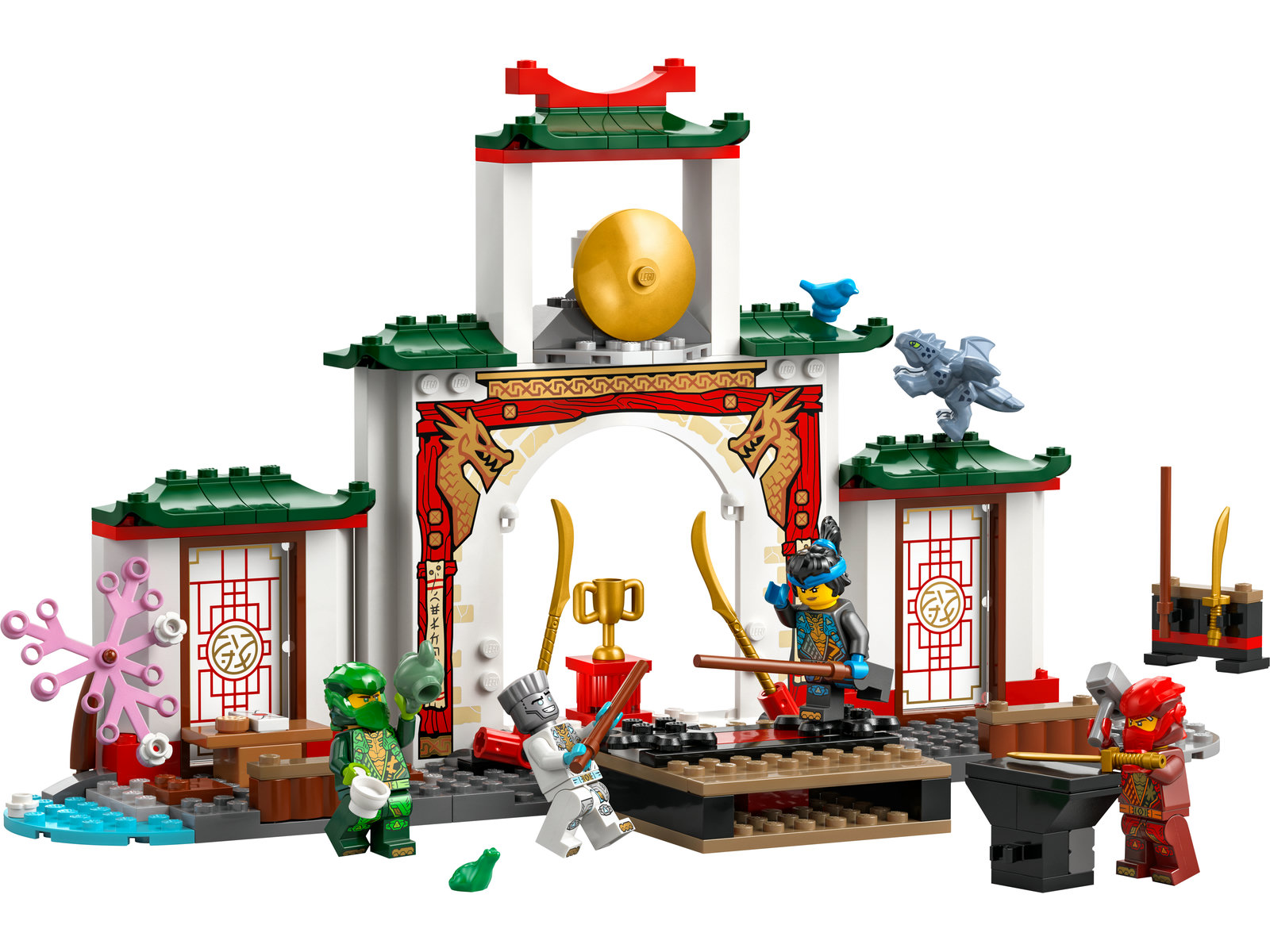 Überrasche einen jungen Ninja-Fan mit dem LEGO® NINJAGO® Spinjitzu-Tempel der Ninja (71831). Dieses Spielset mit Spielzeugdrachen lässt Kinder ab 4 Jahren Abenteuer aus der 3. Staffel der TV-Serie NINJAGO Aufstieg der Drachen nachstellen. Dieses Ninja-Spielset ist perfekt für Rollenspiele auf der NINJAGO Turnierbühne, im Garten, im Teehaus und im Schwertkampftrainingsbereich. Dieses LEGO Set beinhaltet 4 NINJAGO Minifiguren: Zane, Nya, Kai und Lloyd sowie der Spielzeugdrache Baby Riyu laden zu vielen Actionrollenspielen ein. Für spannende Duelle kann man die Minifiguren auf 2 Drehteller stellen. Und auch die umfangreiche Ninja-Ausrüstung (unter anderem 2 Schwerter und 3 Stäbe) sowie ein Hammer, ein Vogel, ein Frosch, ein Siegerpokal, ein Keks und ein Brief bieten unzählige Spielmöglichkeiten. Dieses Ninja-Spielzeug soll Kindern ab 4 Jahren die Freude am Bauen mit LEGO Steinen entdecken lassen und ihnen ein tolles Spielerlebnis bieten. Dem Abenteuerspielzeug liegt auch ein Starter-Bauelement bei. Dabei handelt es sich um ein bereits teilweise zusammengesetztes Bauteil, das Kinder rasch und selbstbewusst bauen lässt.