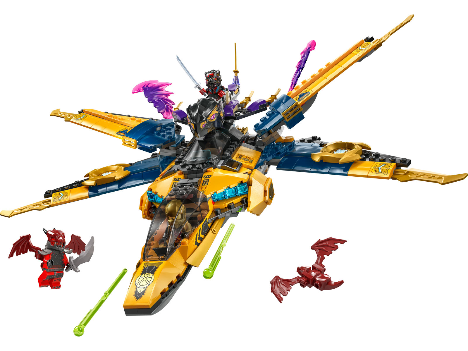 - Ninja-Kombiflieger: Der Spielzeugflieger verfügt über eine abkoppelbare drachenköpfige Drohne und 2 Cockpits. Eines dieser Cockpits lässt sich abtrennen und dient dann als Rettungskapsel mit Flügeln