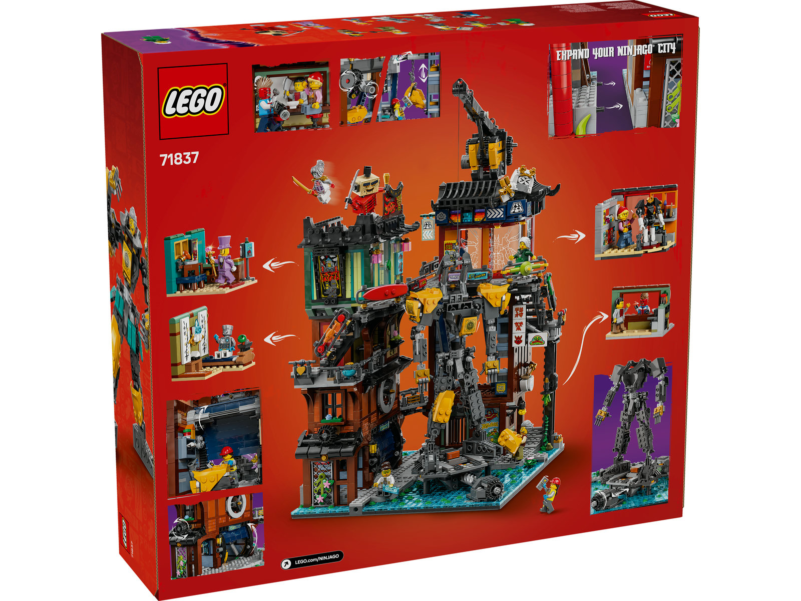 - Spielzeug-Mech zum Anpassen: Zum allerersten Mal gehört zu einem NINJAGO® City Modell auch ein beweglicher Mech, den Kinder mit einer Rüstung und Aufklebern aufpeppen können, bevor sie ihn auf einer Plattform ausstellen