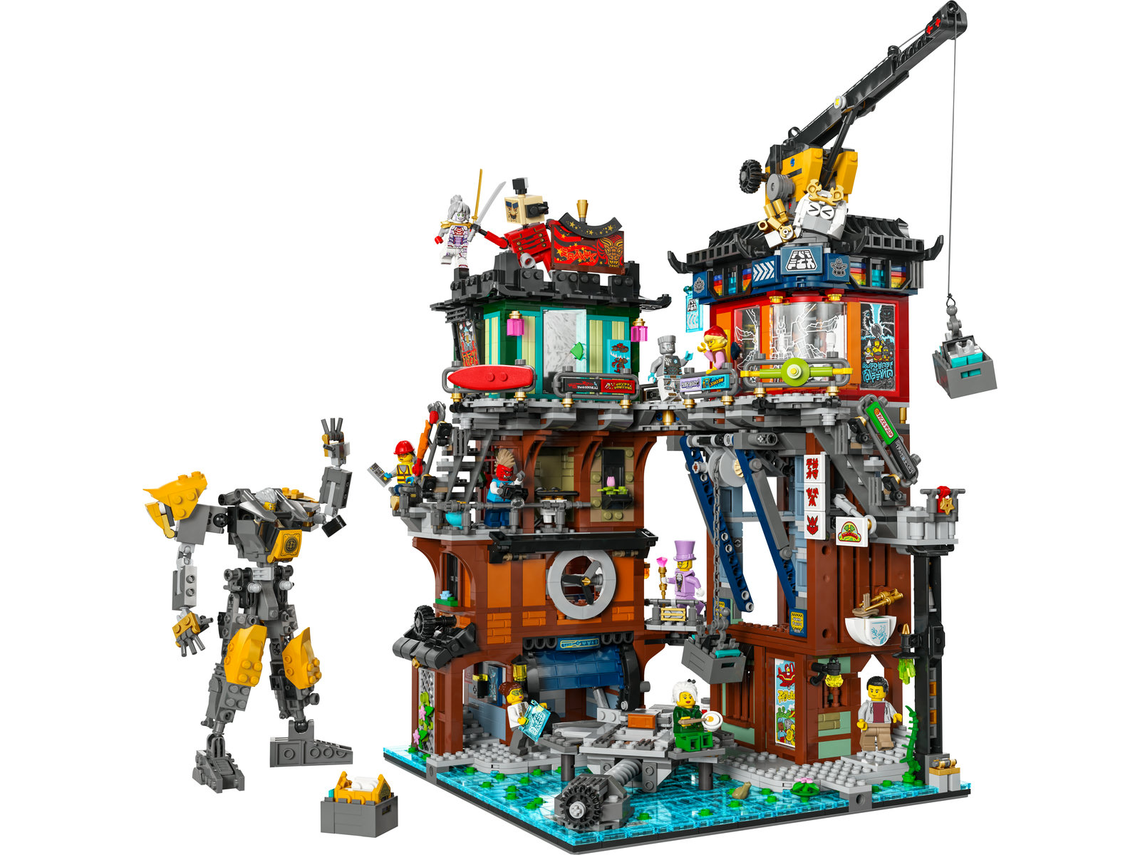 Mit den detailreichen NINJAGO® City Werkstätten (71837) aus diesem Bauset können Ninja-Fans ab 14 Jahren ihre LEGO® NINJAGO City Kollektion wunderbar ergänzen. Einige der Wohnungen, Läden und Restaurants auf den 4 Etagen kann man auch aus diesem großen Modell herausnehmen, um separat mit ihnen zu spielen. Auch 2 Kräne und die Werkstatt eines Mechanikers sind in dem Modell untergebracht. Zum ersten Mal enthält ein NINJAGO City Set auch einen beweglichen Spielzeug-Mech, den Kinder bauen und mit einer Rüstung und Aufklebern aufpeppen können. Die Kräne können die Teile des Mechs zwischen den Etagen hin- und herbewegen. Der fertige Mech kann dann auf einer besonderen Plattform aufgestellt werden. Das Abenteuer-Spielset beinhaltet auch 10 NINJAGO Minifiguren: Zane, Pixal, die Modellwerkstattbesitzerin, die Mechanikerin, einen Kellner und einen Drachentouristen. Zum allerersten Mal sind außerdem Dorama, Dr. LaRow, Harumi, Twitchy Tim und Doramas Marionette aus LEGO Steinen in einem Set enthalten. Mit diesen Charakteren können Fans die legendären Duelle aus der 3. Staffel der TV-Serie NINJAGO Aufstieg der Drachen nachstellen.