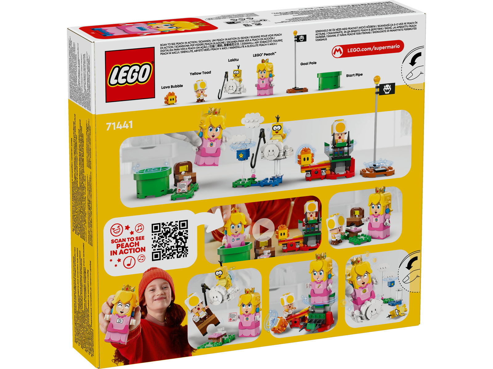 Begleite einen legendären Super Mario™ Charakter auf ein Picknick und flieg auf einer Wolke, um den gelben Toad zu retten. Abenteuer mit der interaktiven LEGO® Peach™ (71441) ist ein faszinierendes Kinderspielzeug und ein tolles Nintendo® Geschenk für Jungen, Mädchen und Gamer ab 6 Jahren. Das Set beinhaltet die interaktive LEGO Peach sowie drei Spielzeugfiguren – Lakitu, einen gelben Toad und einen Hothead. Begib dich von der Röhre zum Zielpfahl und lass LEGO Peach unterwegs digitale Reaktionen zeigen und Münzen sammeln. Mach ein Picknick, lies einen Brief, in dem steht, dass der gelbe Toad entführt wurde, stoße Lakitu von der Wolke und mach auf der Wolke Loopings und Saltos, während du zur Rettung des gelben Toads unterwegs bist. An der baubaren Spielzeugwolke befindet sich eine Angel, mit der Lakitu den Picknickstuhl des Toads raufziehen kann. Eine Bauanleitung findest du in der Box oder in der LEGO Super Mario App. Kombiniere die Modelle und Charaktere aus diesem Spielset für weitere Abenteuer mit anderen Sets aus dem breiten LEGO Super Mario Angebot.
