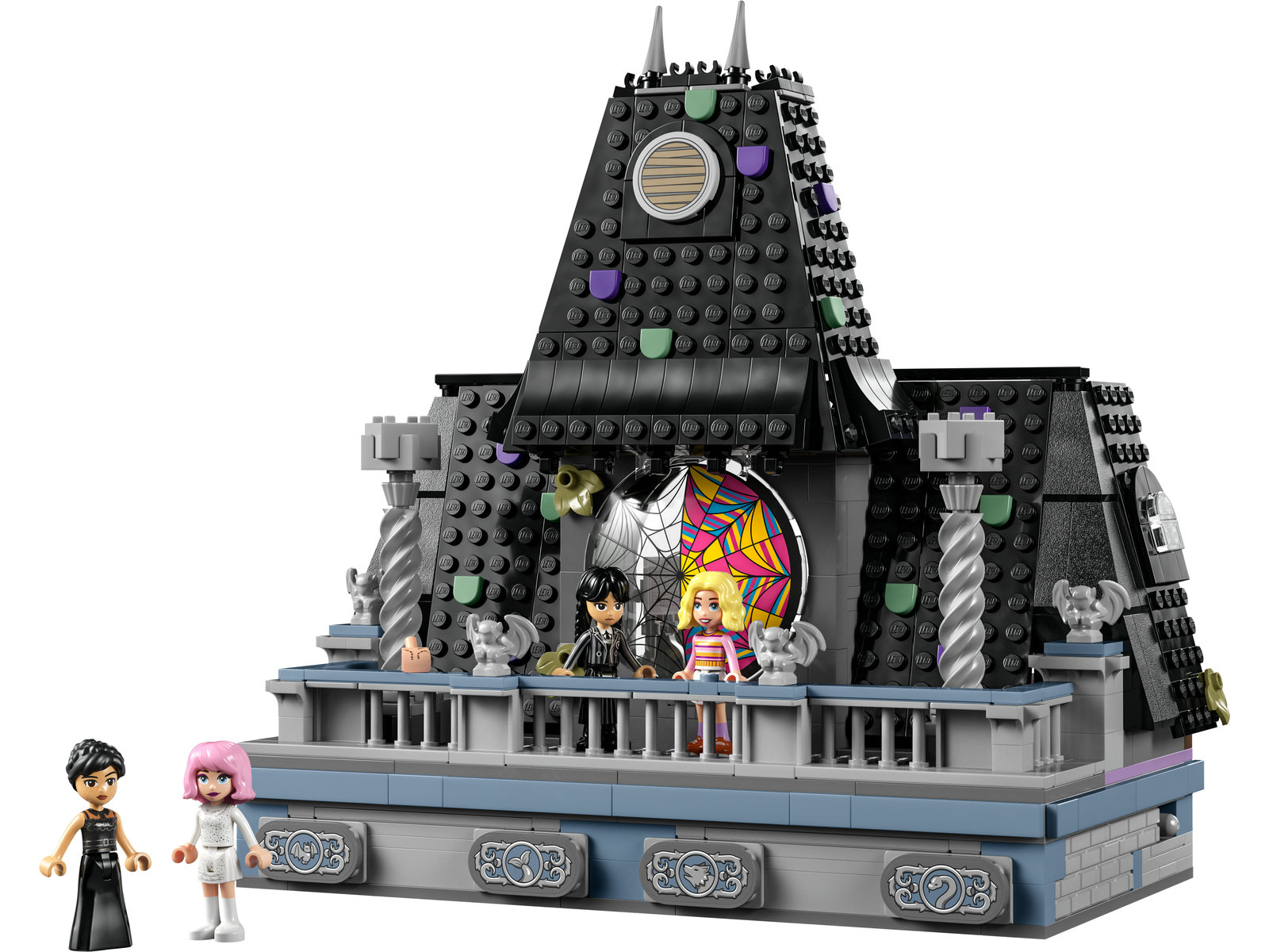 - Nevermore Academy Set : Das Schulspielset beinhaltet ein baubares Internatszimmer mit aufklappbarem Fenster (mit Spinnennetzrissen), einen Sockel mit Knöpfen zum Öffnen der Geheimfächer und einen Balkon mit 4 Wasserspeiern