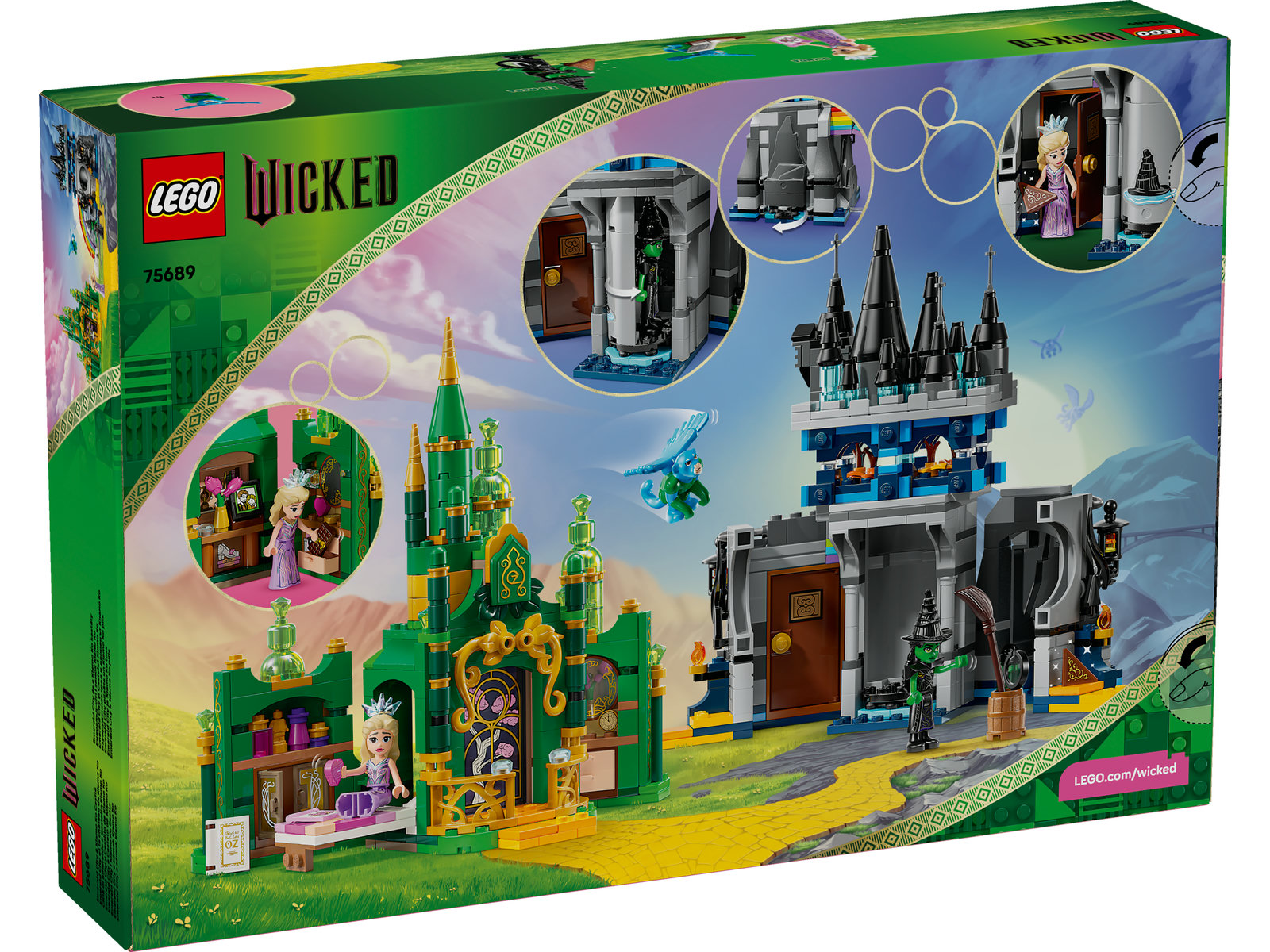 - LEGO® Wicked Set für viele Abenteuer: Emerald City & Kiamo Ko Castle ist ein Bau- und Spielset mit 2 baubaren Modellen, den LEGO Wicked Spielfiguren Elphaba und Glinda, einem fliegenden Affen und einem baubaren Regenbogen